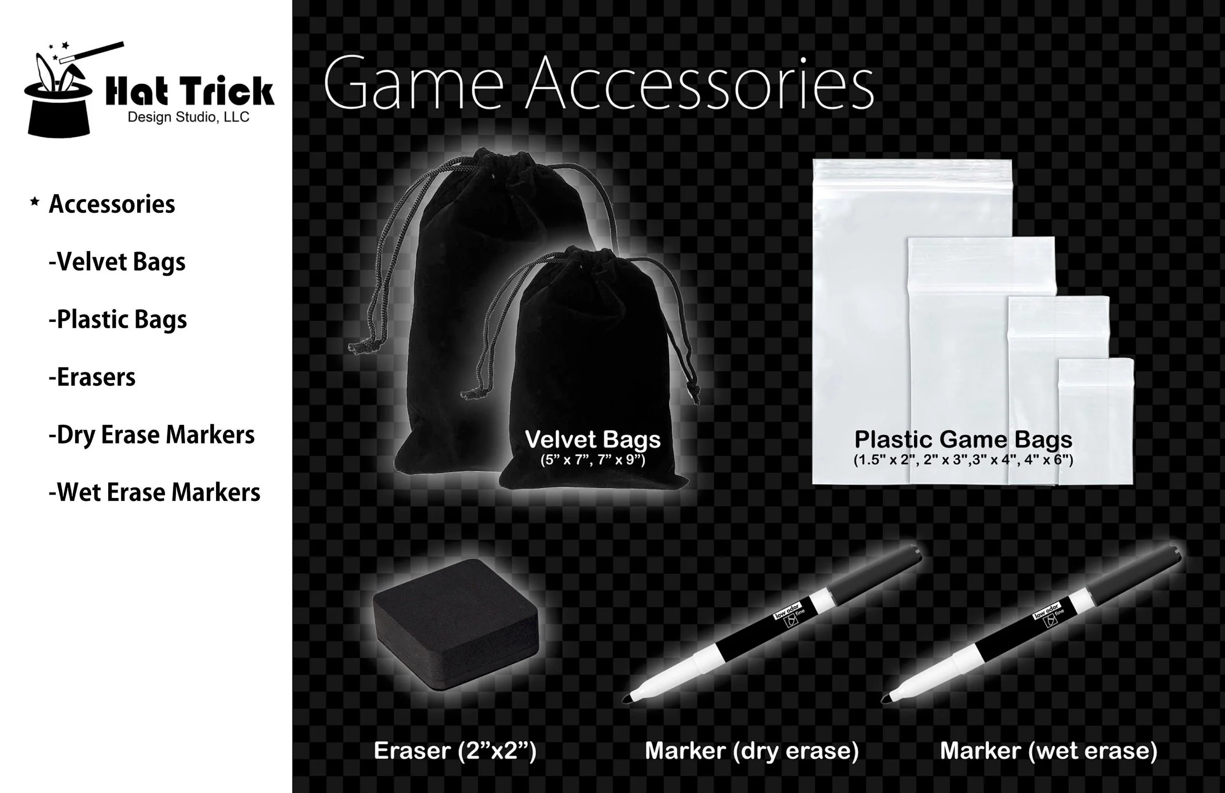 Accessories and Add-on items, Velvet Bags, Plastic Bags, Wet Erase Markers and Dry Erase Markers, Game Tokens
