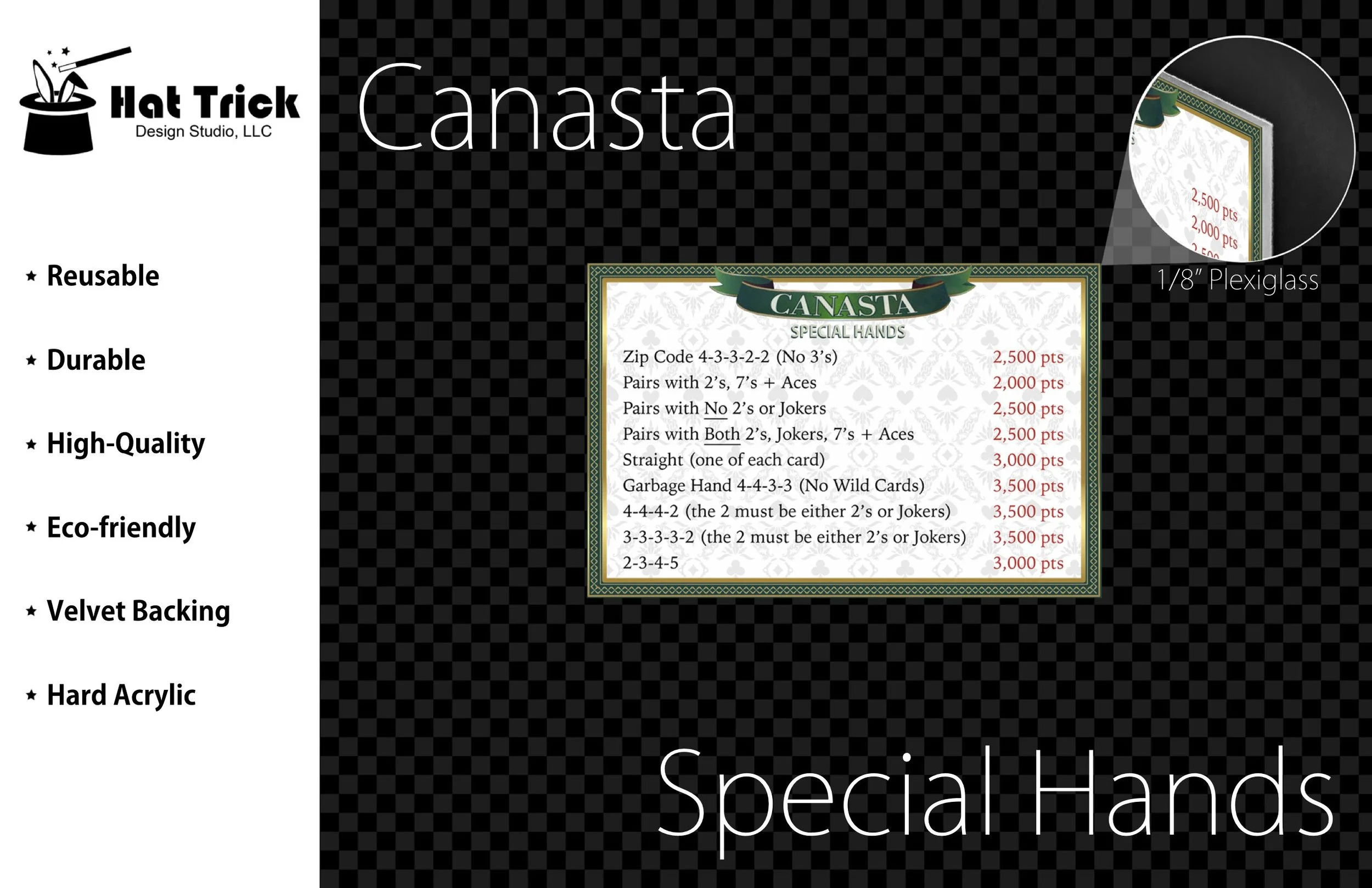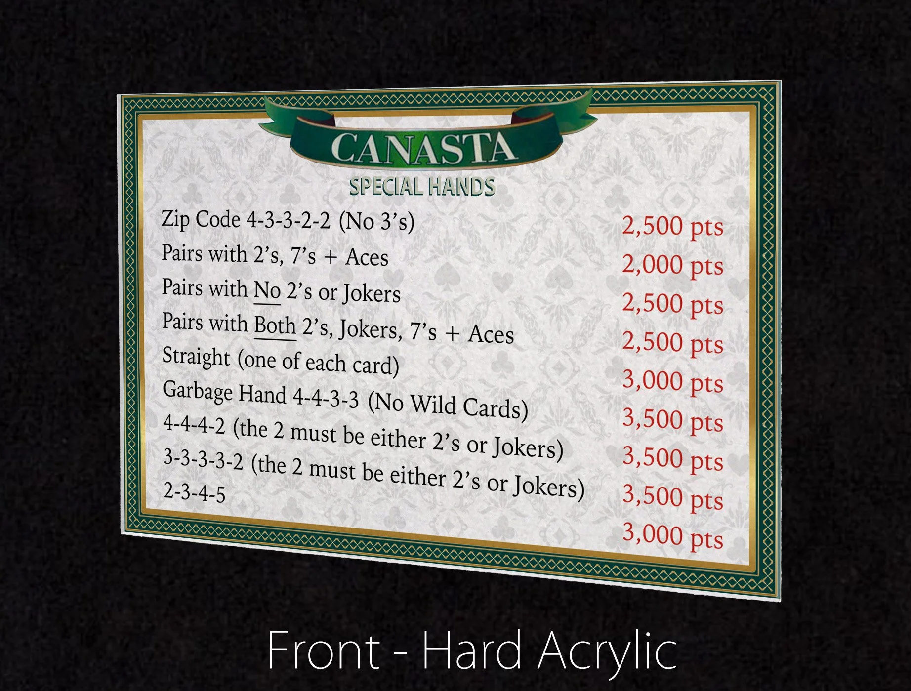 These Hard Acrylic Deluxe Canasta Special Hands Plaques are made of 1/8" PREMIUM GRADE PLEXIGLASS. The backing is finished with a white velvet material that is SOFT TO THE TOUCH to protect playing surfaces. Made in the USA with premium DURABLE materials to last for years.