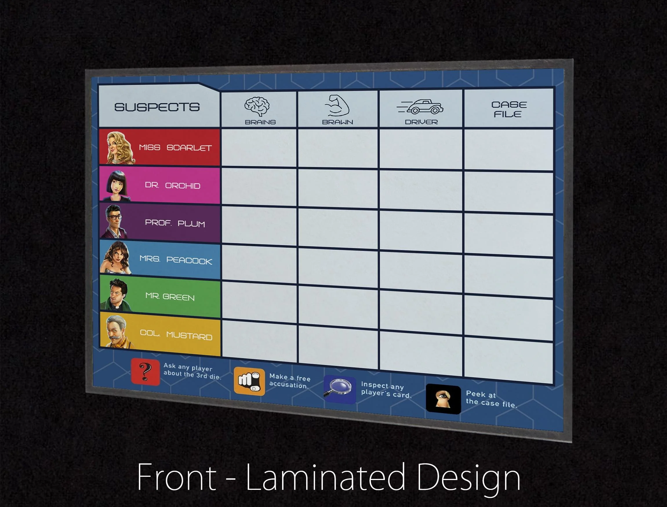 These Clue Diced! Score Sheets are printed and laminated with HIGH QUALITY materials and designed to be reused over and over again.