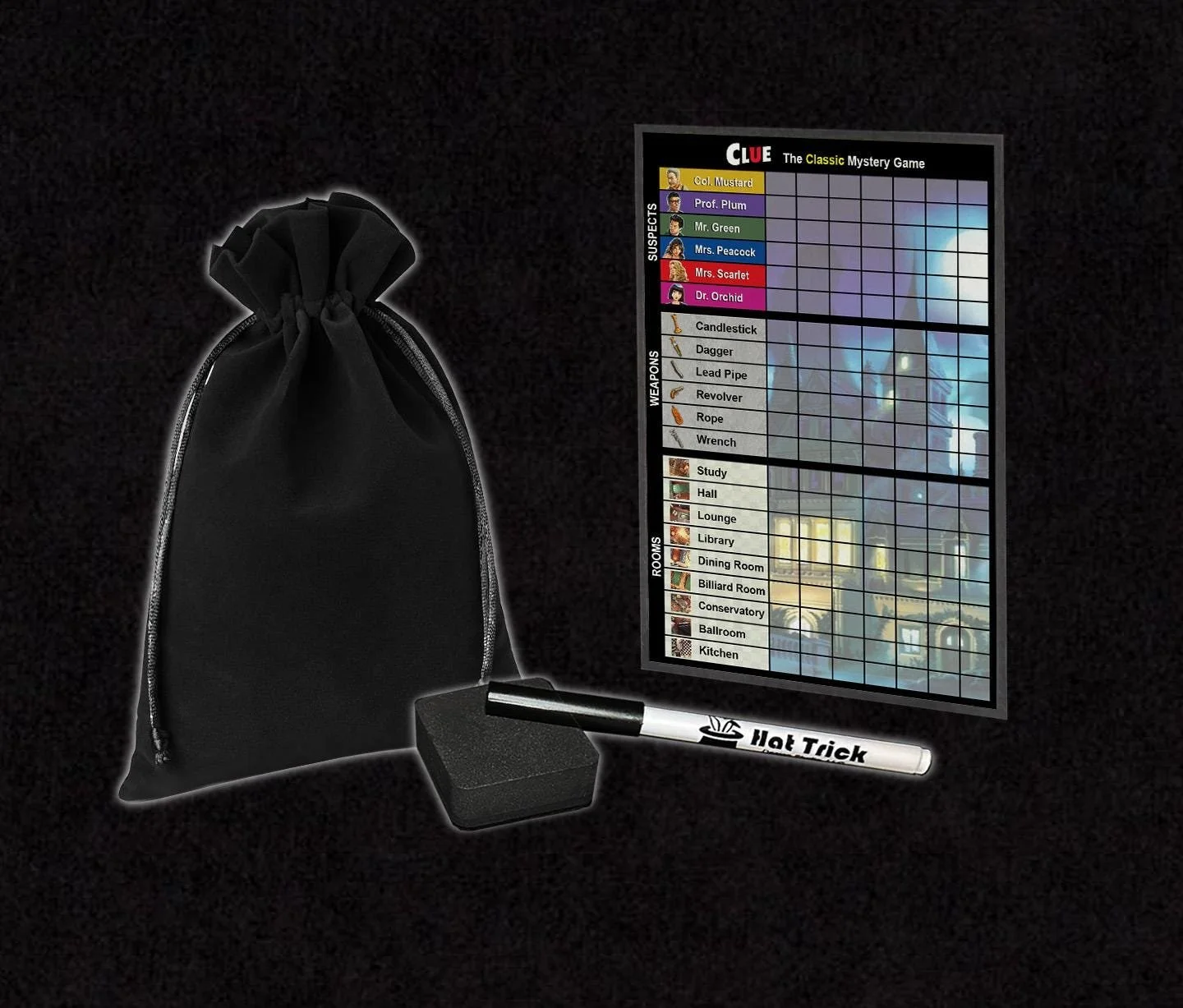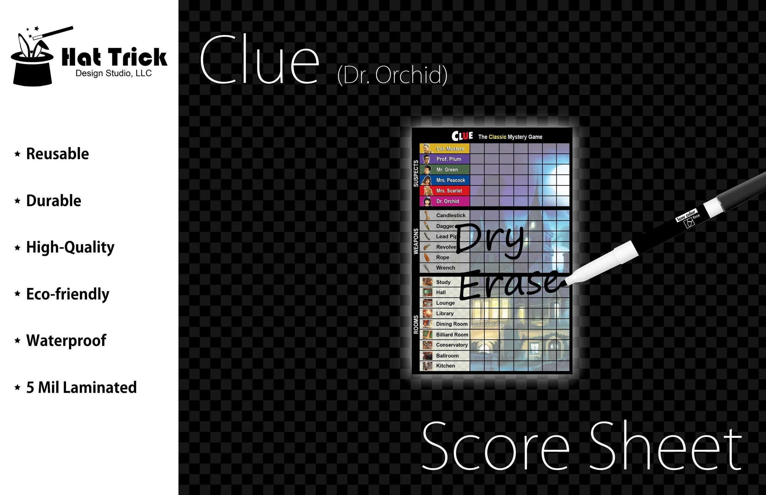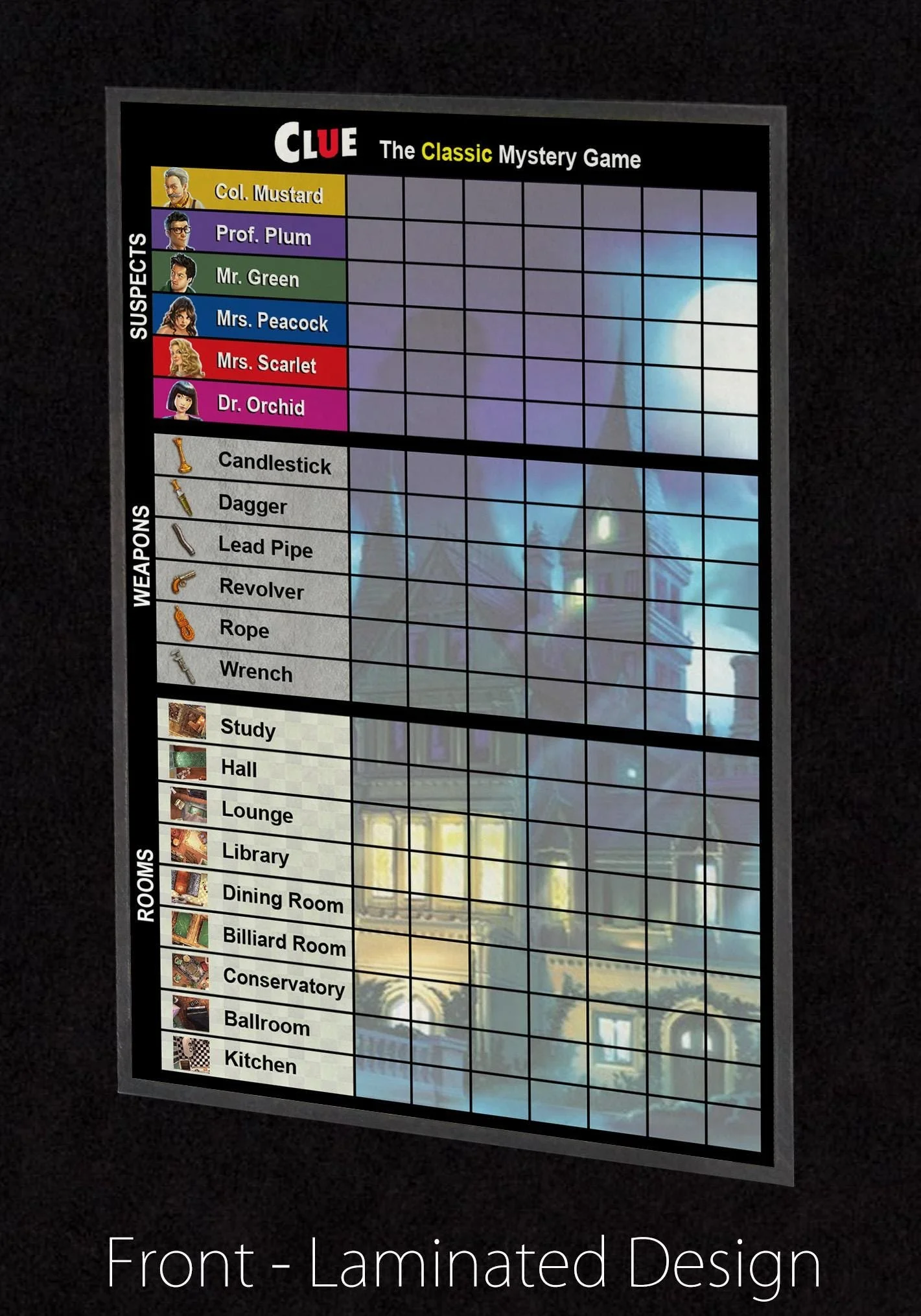These Clue (Dr. Orchid) Score Sheets are printed and laminated with HIGH QUALITY materials and designed to be reused over and over again.