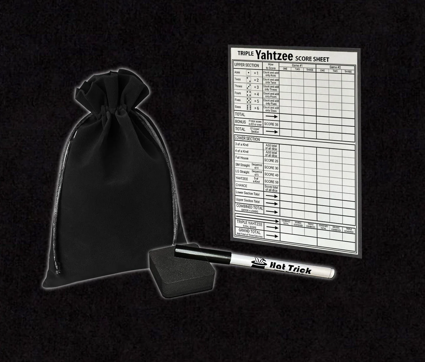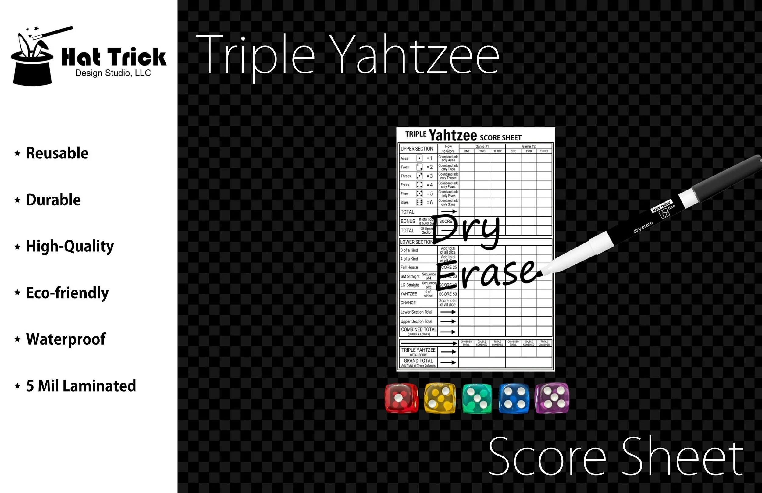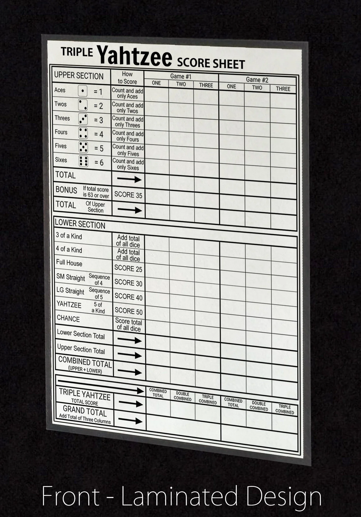 These Triple Yahtzee Score Sheets are printed and laminated with HIGH QUALITY materials and designed to be reused over and over again.