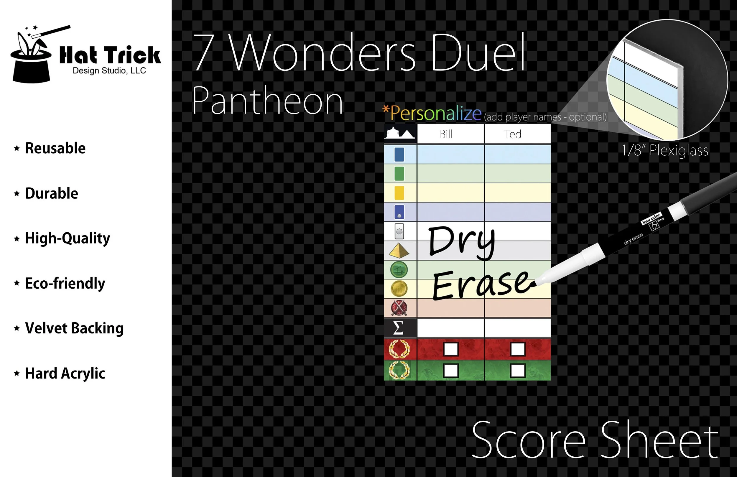 These 7 Wonders Duel Pantheon Score Sheets are made of 1/8" PREMIUM ACRYLIC. The backing is finished with a white velvet material that is SOFT TO THE TOUCH to protect playing surfaces. Made in the USA with premium DURABLE materials to last for years.