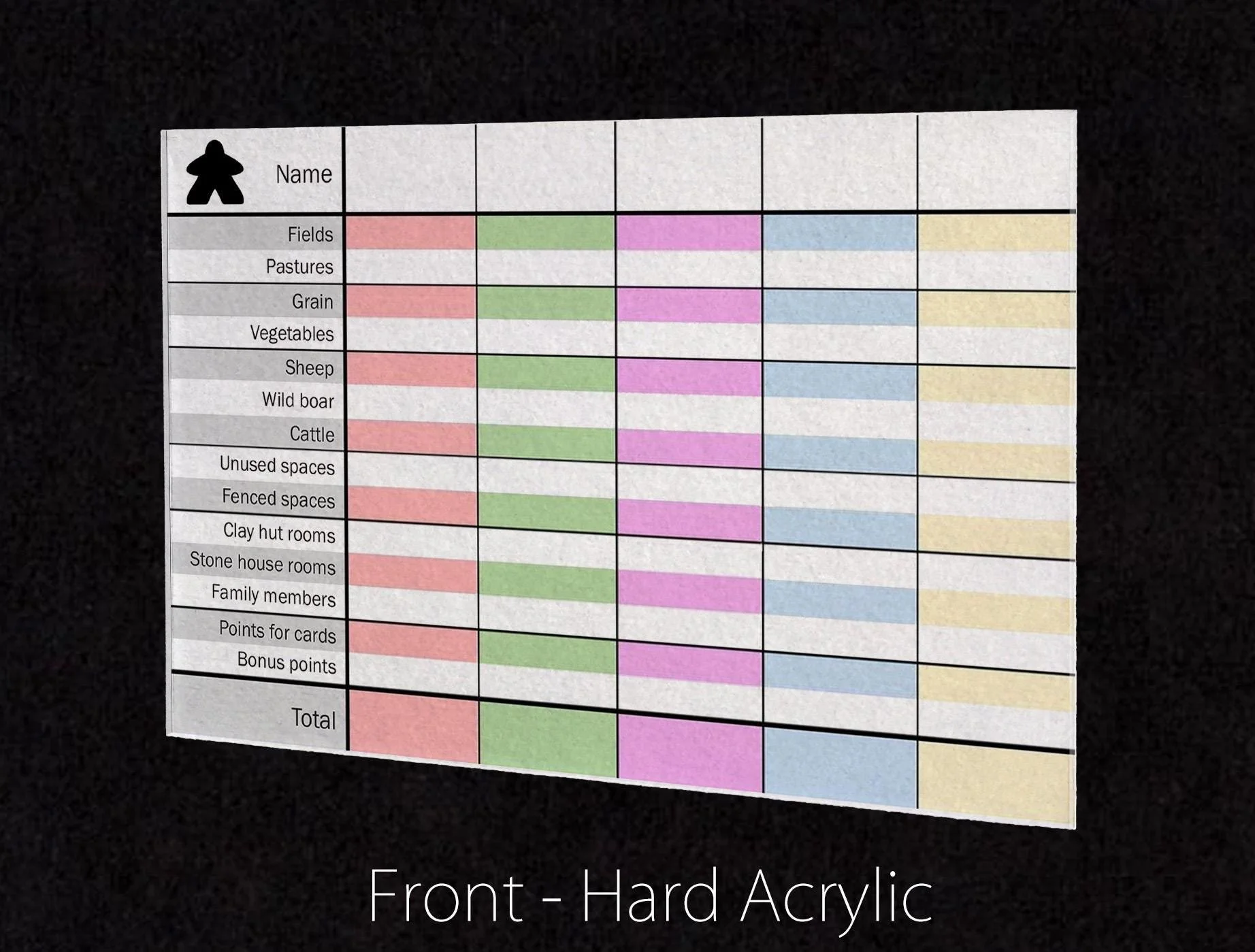 These Agricola Score Sheets are made of 1/8" PREMIUM ACRYLIC. The backing is finished with a white velvet material that is SOFT TO THE TOUCH to protect playing surfaces. Made in the USA with premium DURABLE materials to last for years.