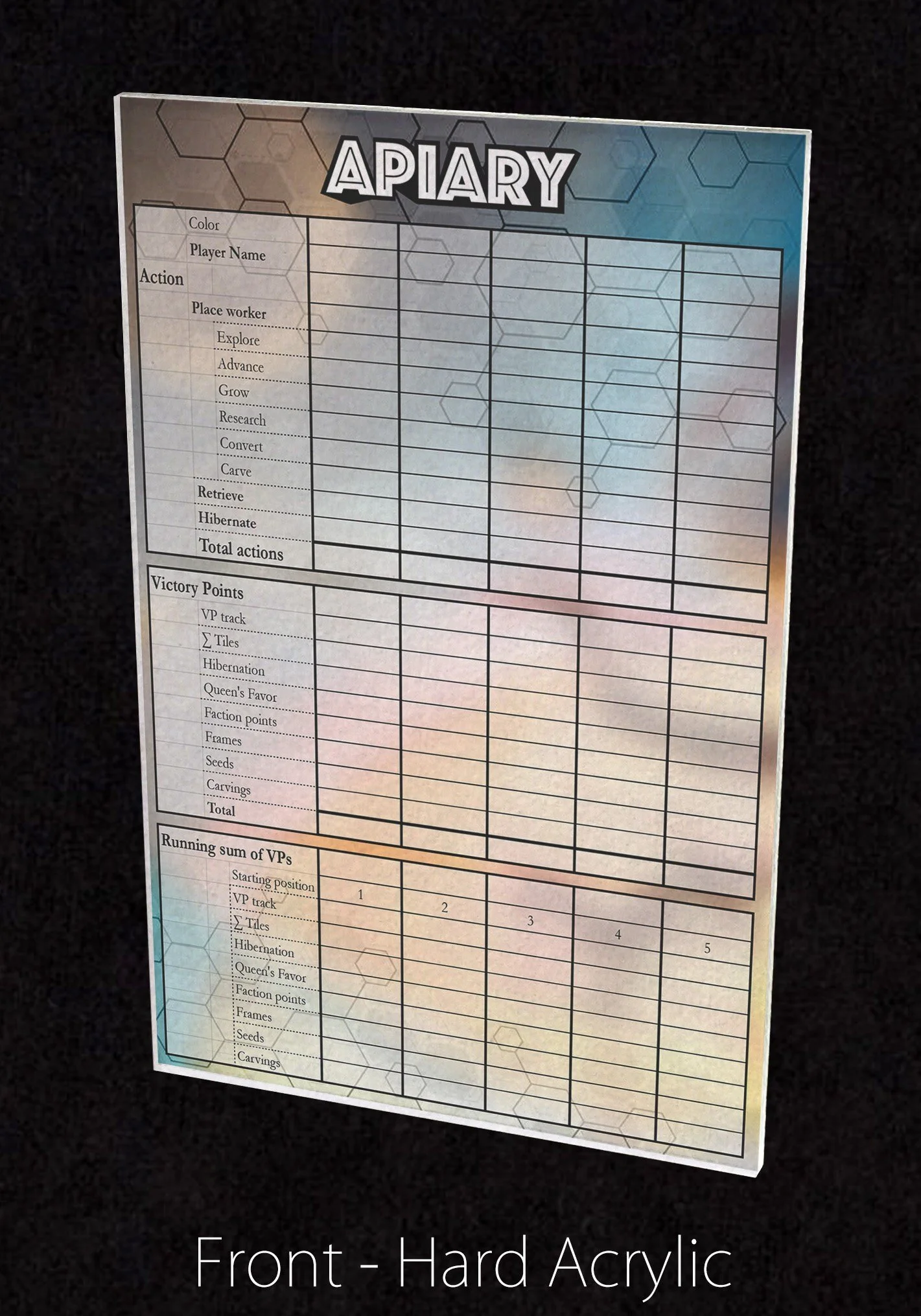 Not an official Stonemaier Games Product. This is a fantastic dry erase score sheet plaque to use for the Apiary published by Stonemaier, designed by Connie Vogelmann, art by Kwanchai Moriya.