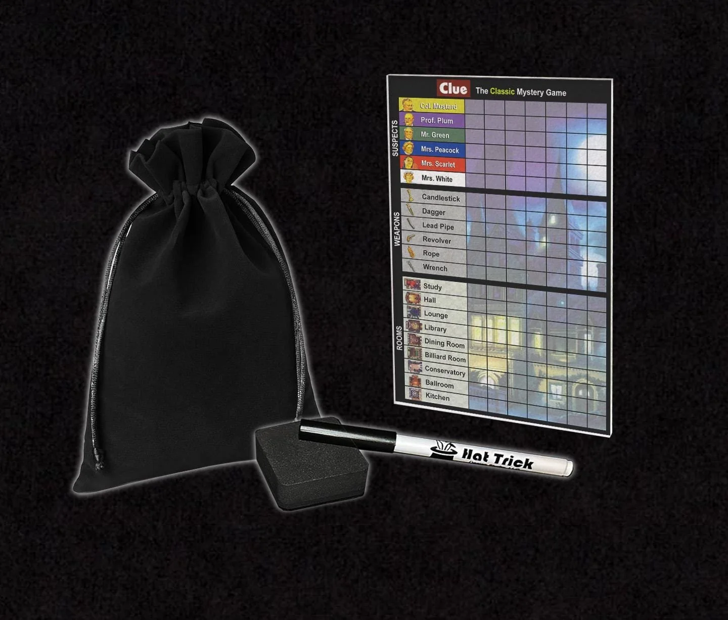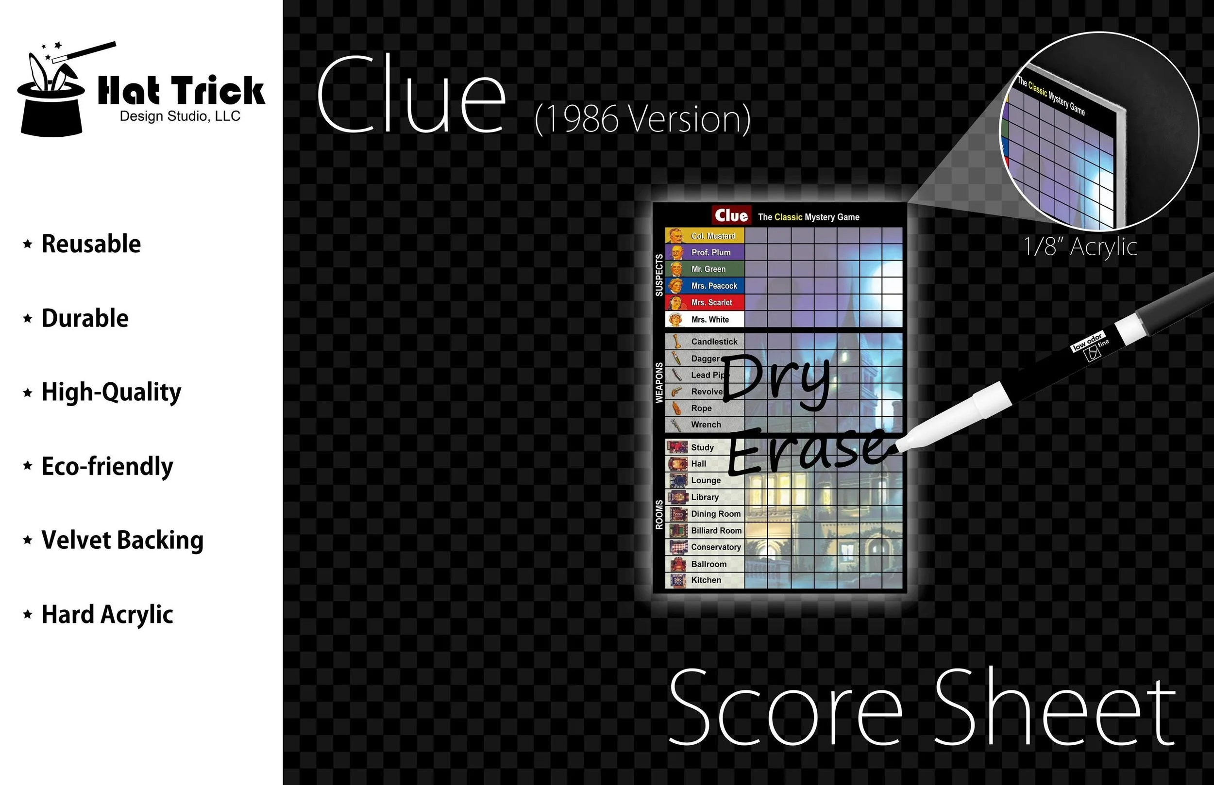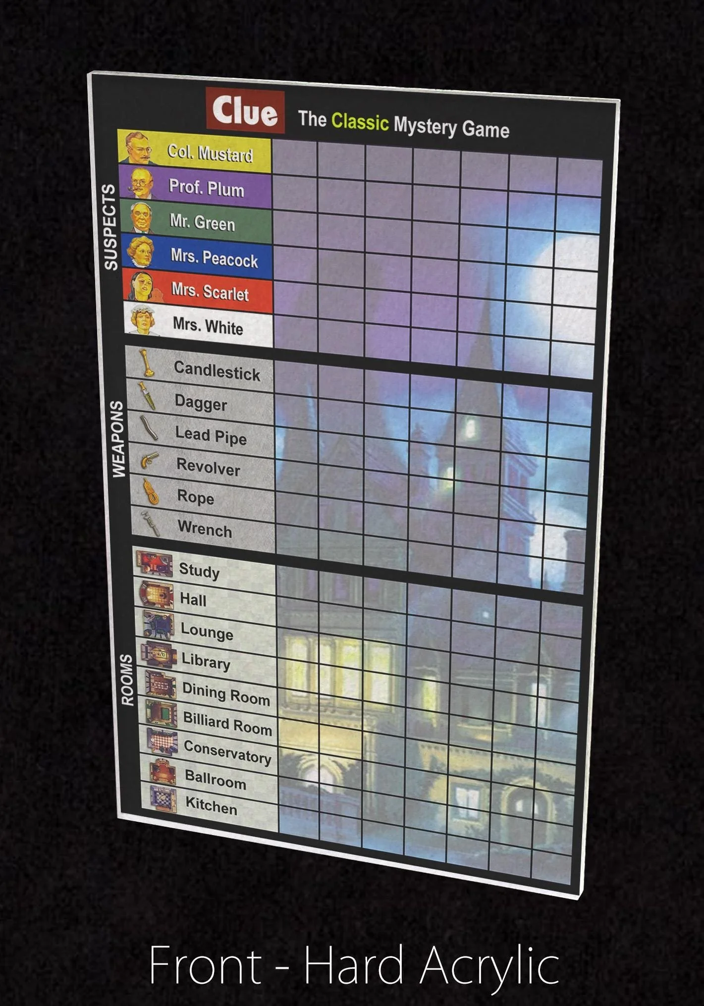 Premium Acrylic Clue (1986 Version) Score Sheet Upgrade, Reusable, Wet Erase and Dry Erase