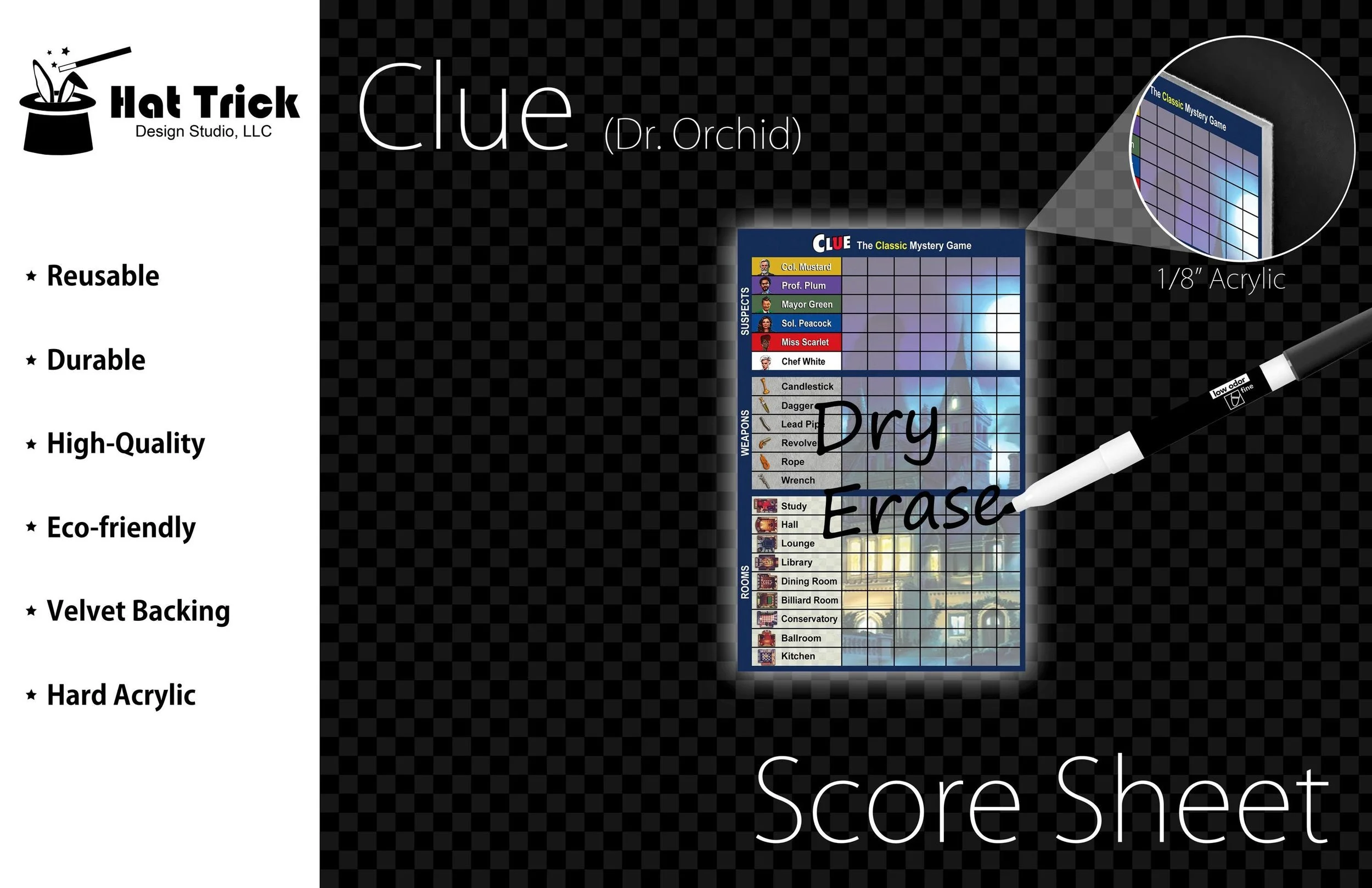 Premium Acrylic Clue (2023 Version) Score Sheet Upgrade, Reusable, Wet Erase and Dry Erase