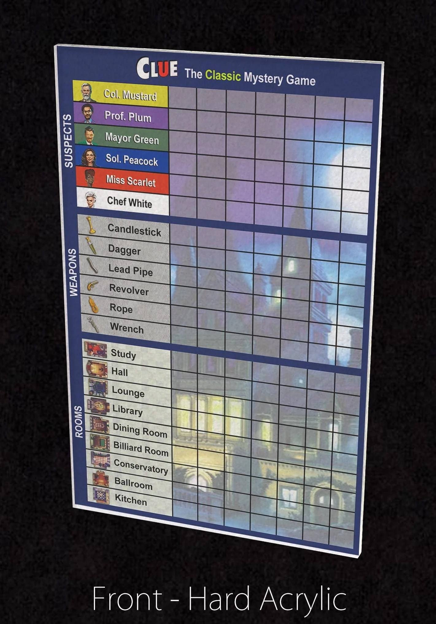 These Clue Score Sheets are made of 1/8" PREMIUM ACRYLIC. The backing is finished with a white velvet material that is SOFT TO THE TOUCH to protect playing surfaces. Made in the USA with premium DURABLE materials to last for years.
