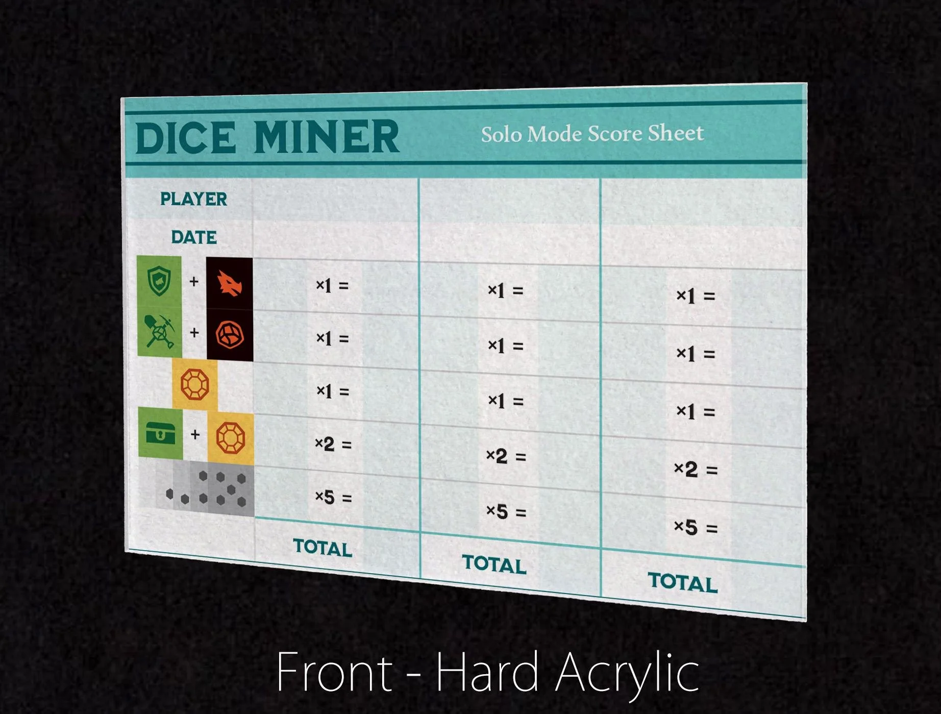 These Dice Miner Score Sheets are made of 1/8" PREMIUM ACRYLIC. The backing is finished with a white velvet material that is SOFT TO THE TOUCH to protect playing surfaces. Made in the USA with premium DURABLE materials to last for years.