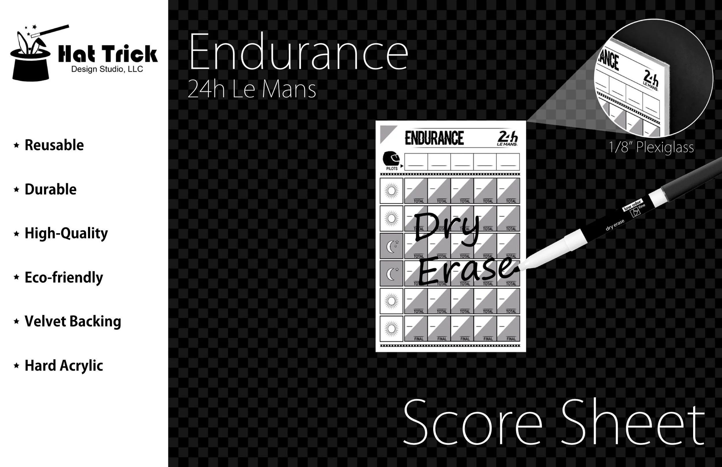 These Endurance 24h Le Mans Score Sheets are made of 1/8" PREMIUM ACRYLIC. The backing is finished with a white velvet material that is SOFT TO THE TOUCH to protect playing surfaces. Made in the USA with premium DURABLE materials to last for years.