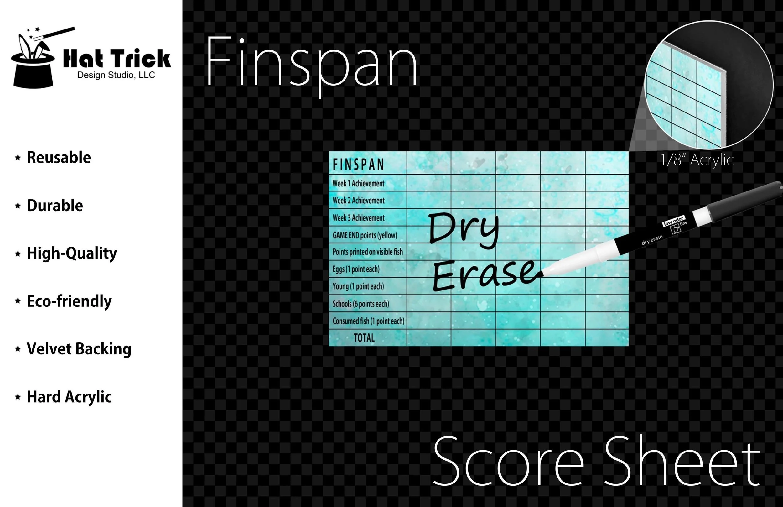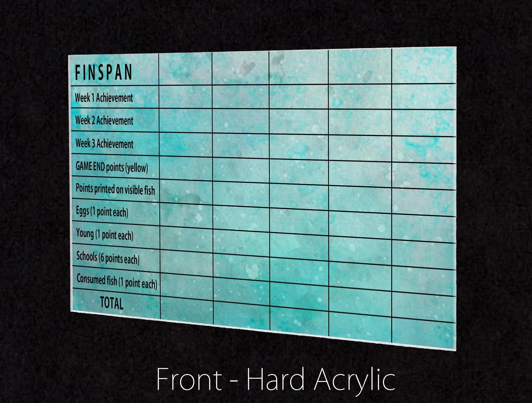 *Not an official Stonemaier Games Product. This is a fantastic dry erase score sheet plaque to use for the Finspan game designed by David Gordon and Michael O'Connell, developed by Elizabeth Hargrave, published by Stonemaier and illustrated by Ana Maria Martinez, Catalina Martinez, Mesa Schumacher with support from Natalia Rojas.