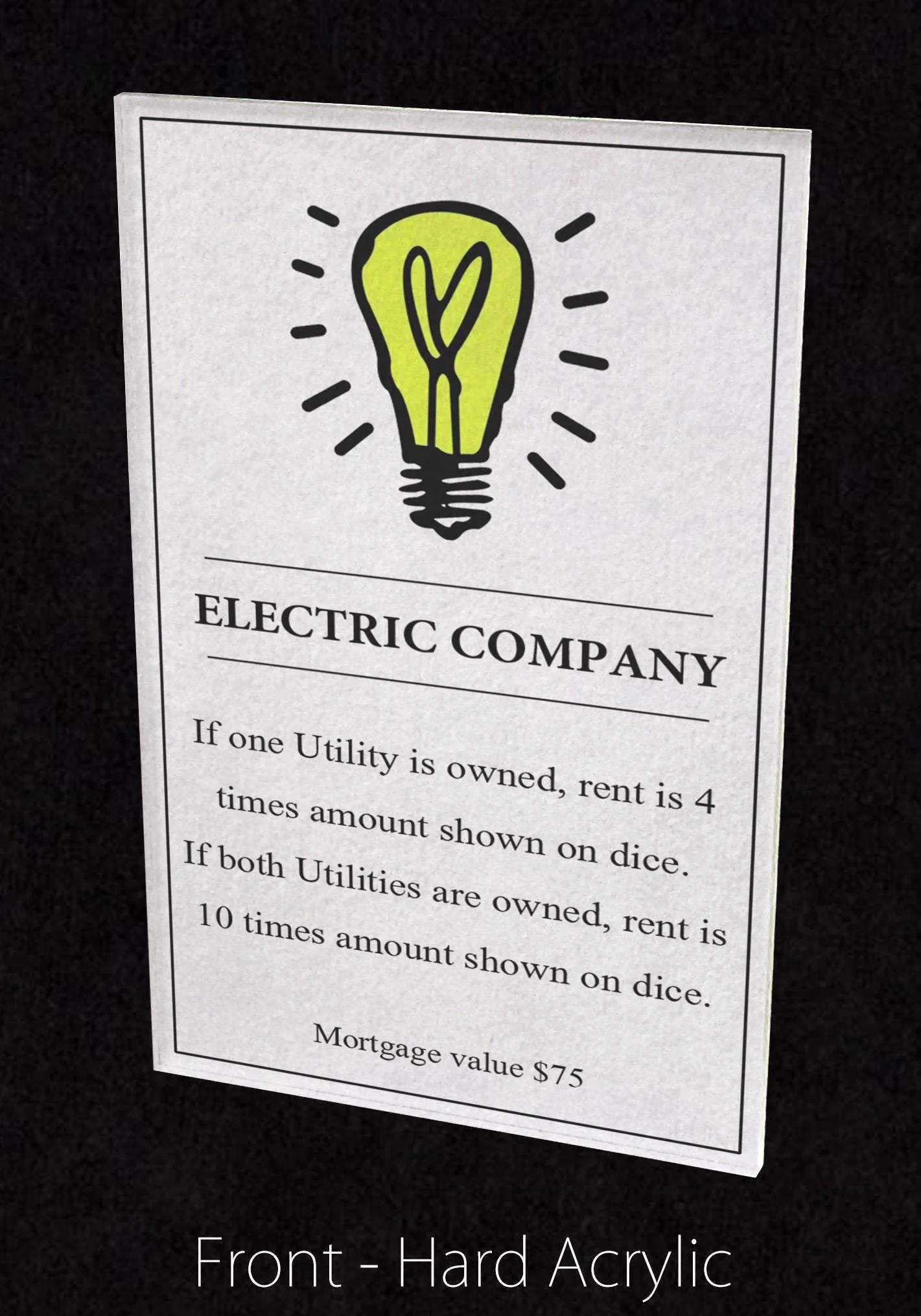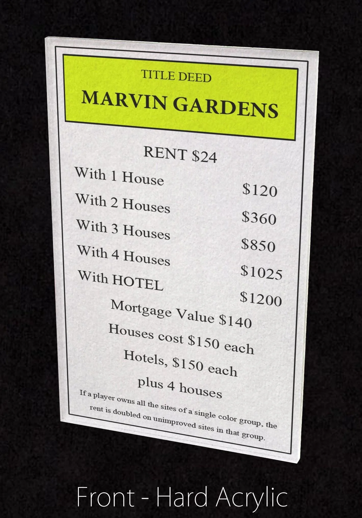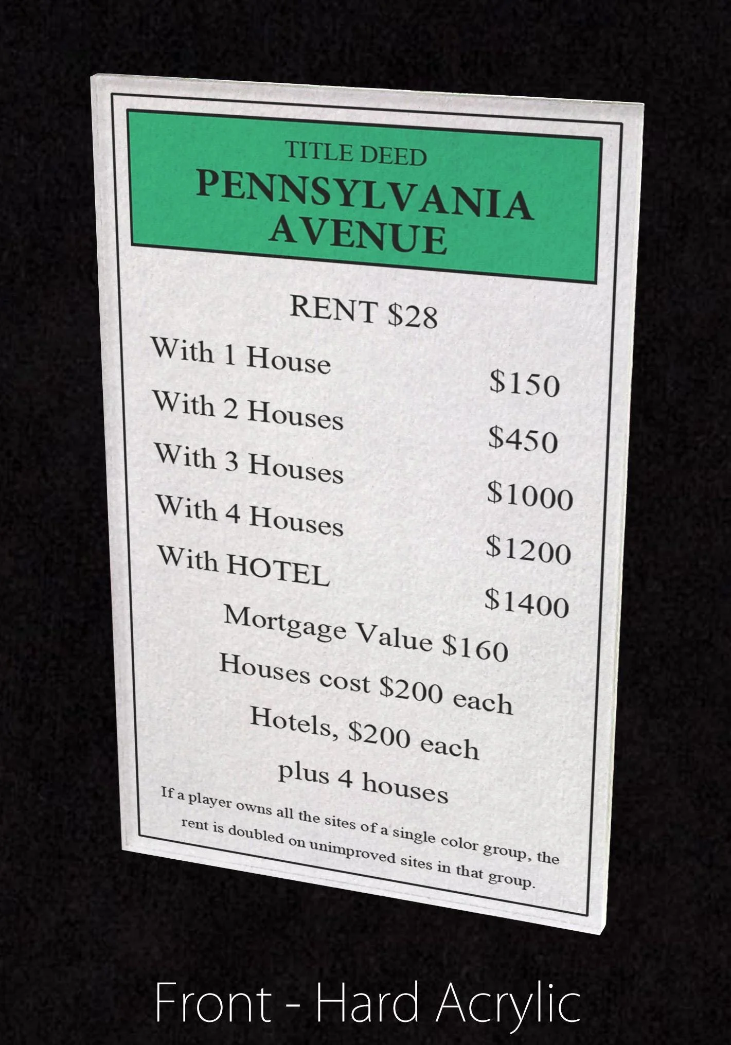 These Monopoly Property Deed Plaques are made of 1/8" PREMIUM ACRYLIC. The backing is finished with a white velvet texture that is SOFT TO THE TOUCH. Made in the USA with premium DURABLE materials to last for years.