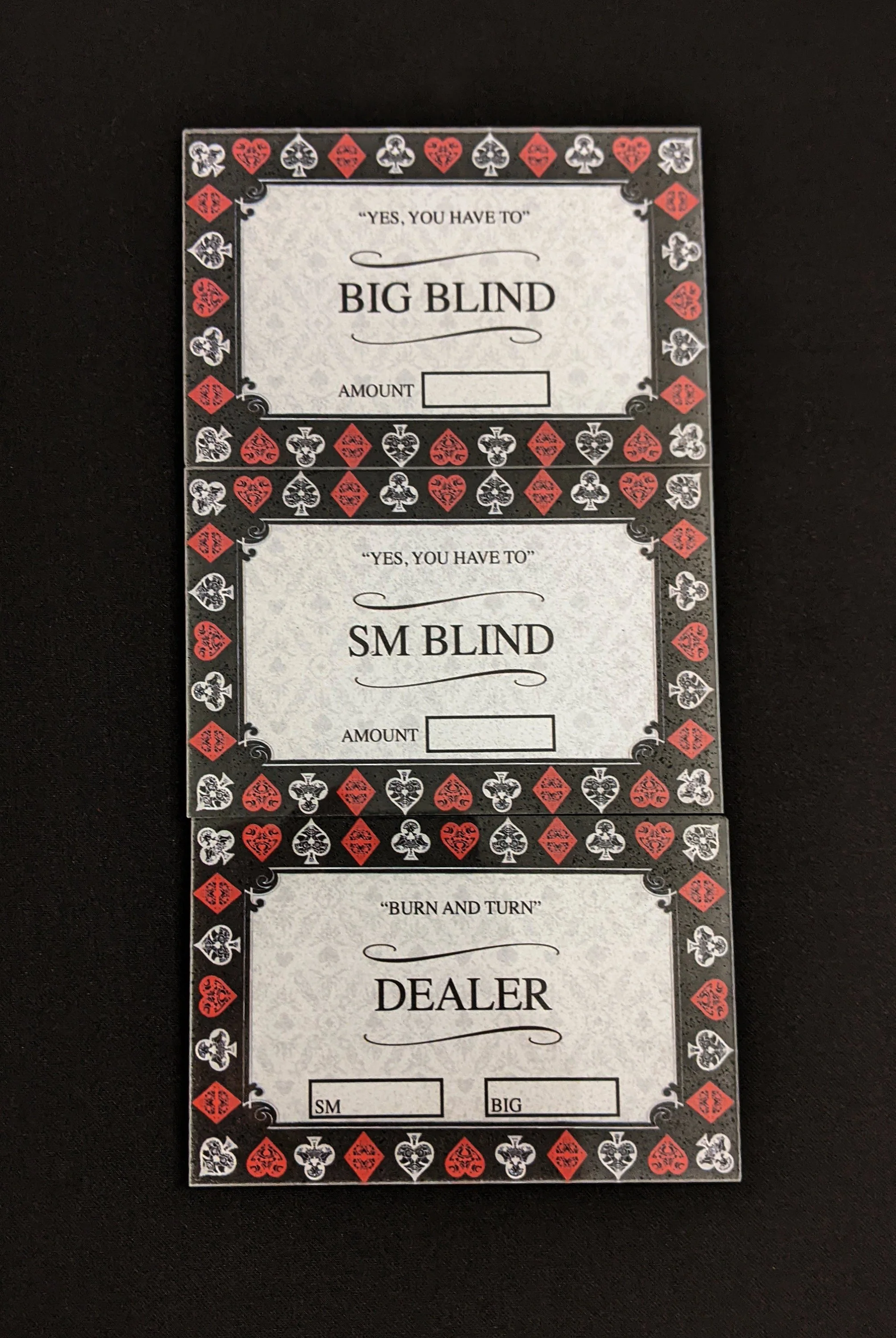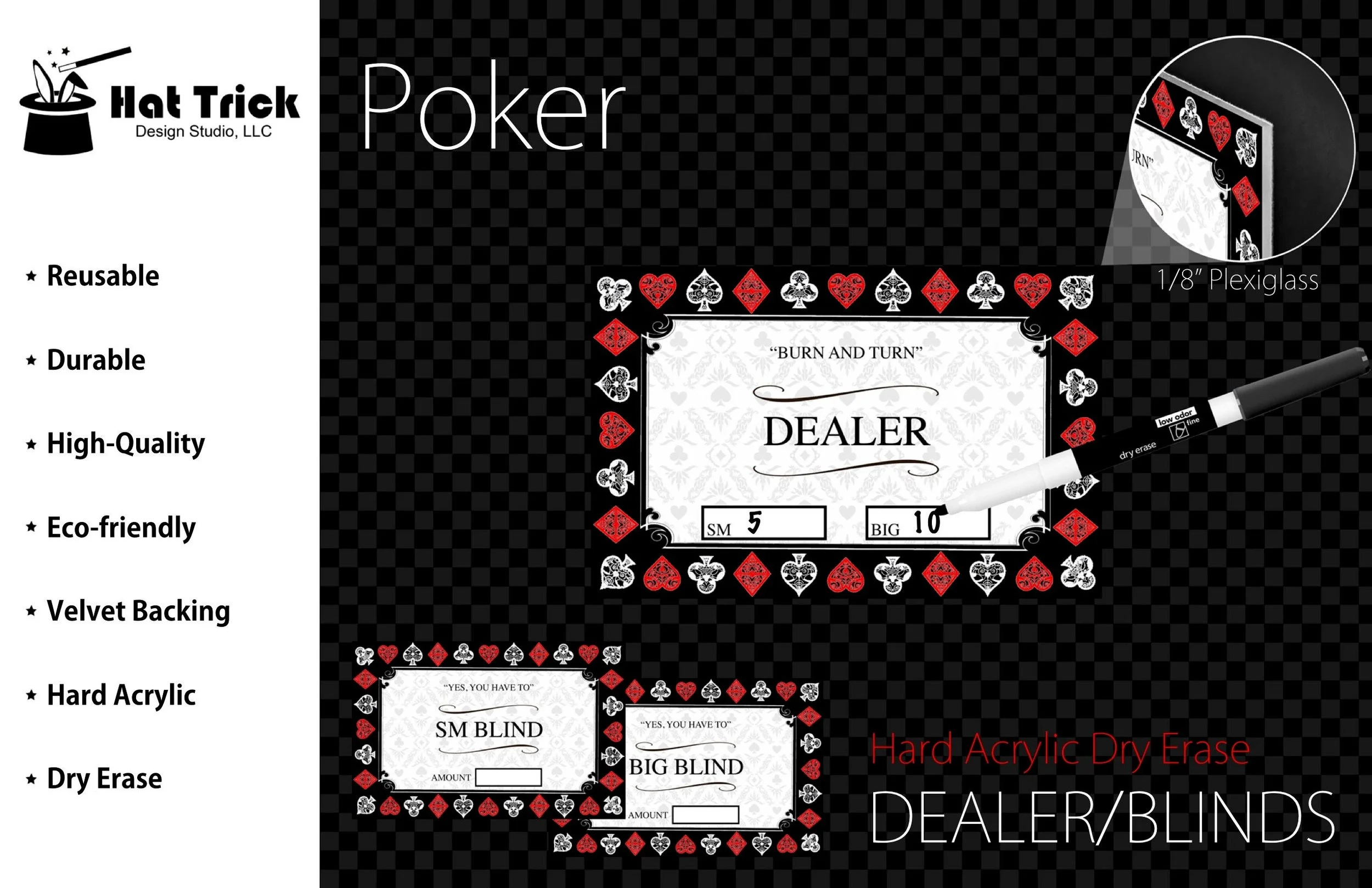 These Deluxe Poker Dealer, Small Blind, and Big Blind Plaques are a must have tool during poker games. With the included dry erase marker simply write down the blind amounts and each plaque so that everyone playing can easily know the amounts needed to play each hand. When the blind amounts change, erase with a fine cloth and write down the new amounts.