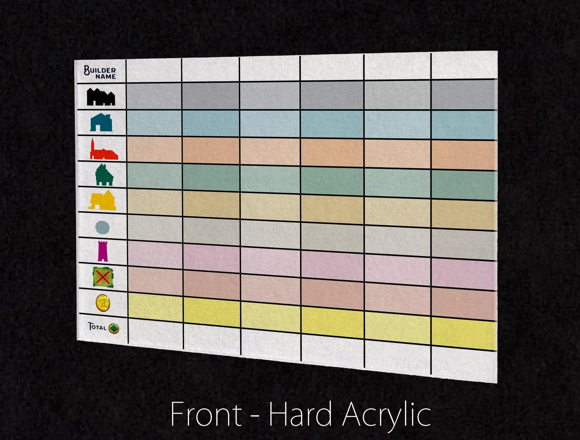 These Tiny Towns Fortunes Score Sheets are made of 1/8" PREMIUM ACRYLIC. The backing is finished with a white velvet material that is SOFT TO THE TOUCH to protect playing surfaces. Made in the USA with premium DURABLE materials to last for years.