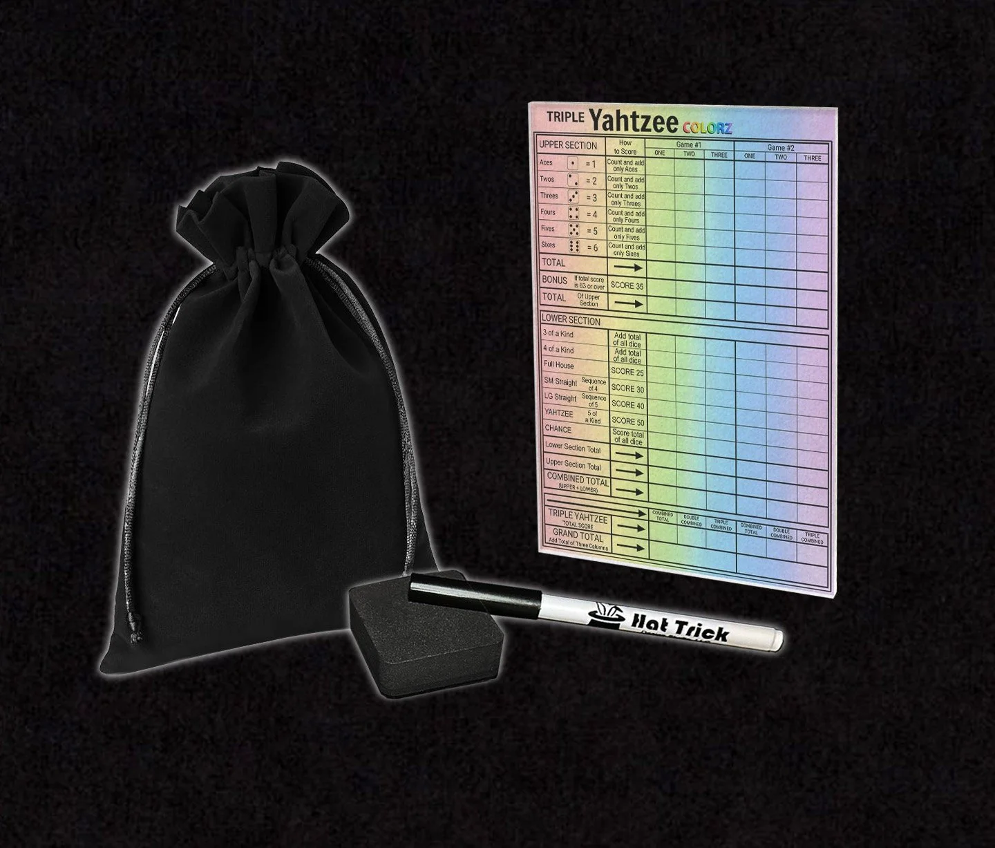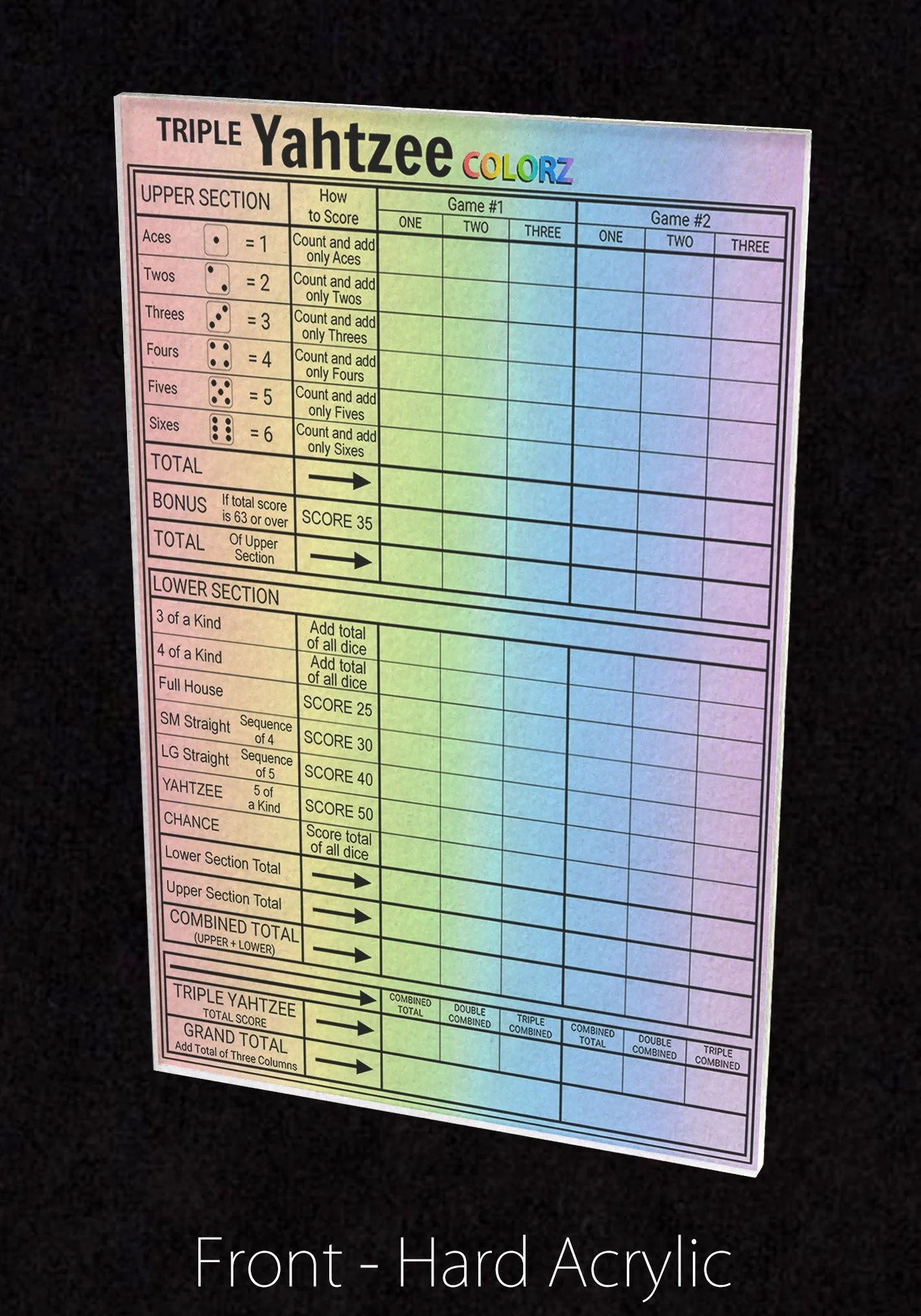 Premium Acrylic Triple Yahtzee Colorz Score Sheet Upgrade, Reusable, Wet Erase and Dry Erase