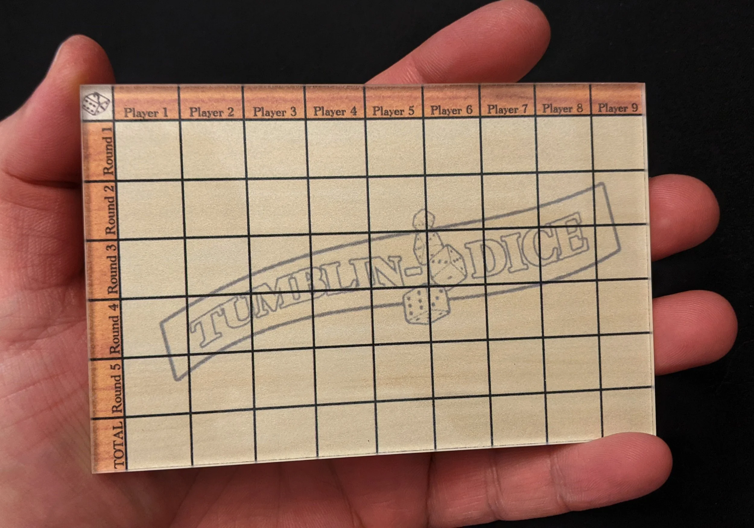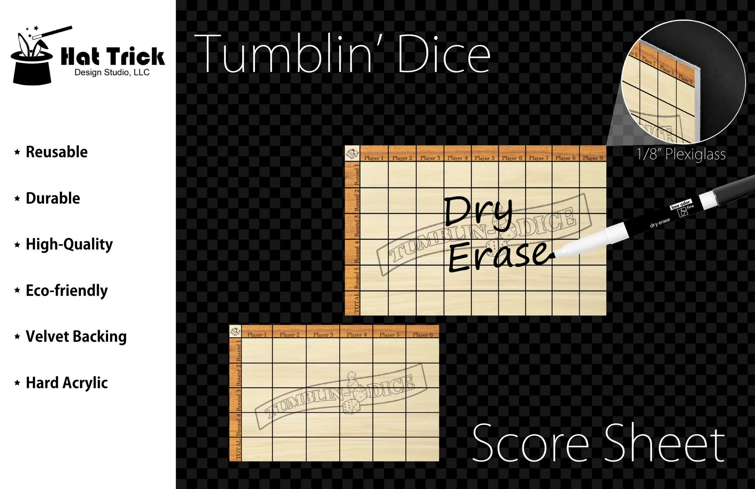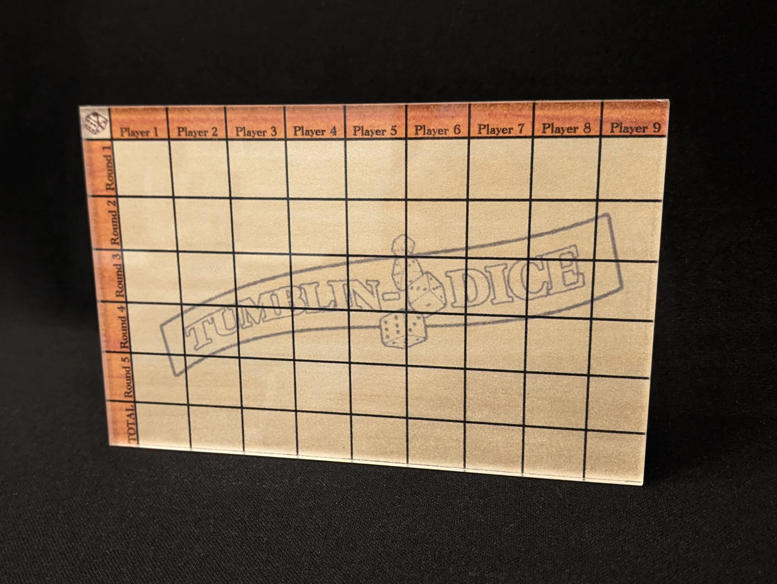 These Tumblin' Dice Score Sheets are made of 1/8" PREMIUM ACRYLIC. The backing is finished with a white velvet material that is SOFT TO THE TOUCH to protect playing surfaces. Made in the USA with premium DURABLE materials to last for years.