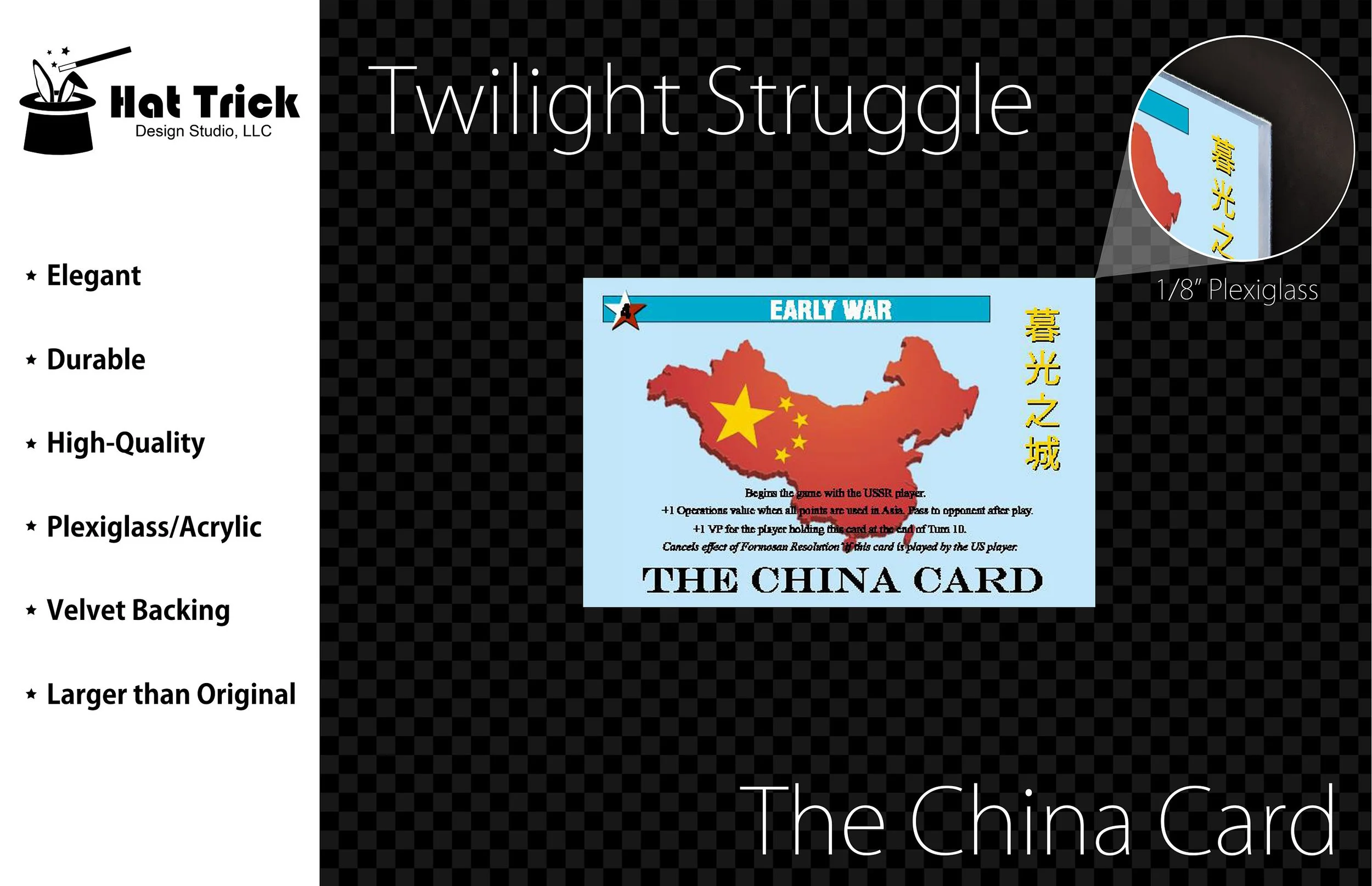 -EASY TO READ - The China Card plaque is much larger and thicker than traditional Twilight Struggle China cards which makes them much easier to read,