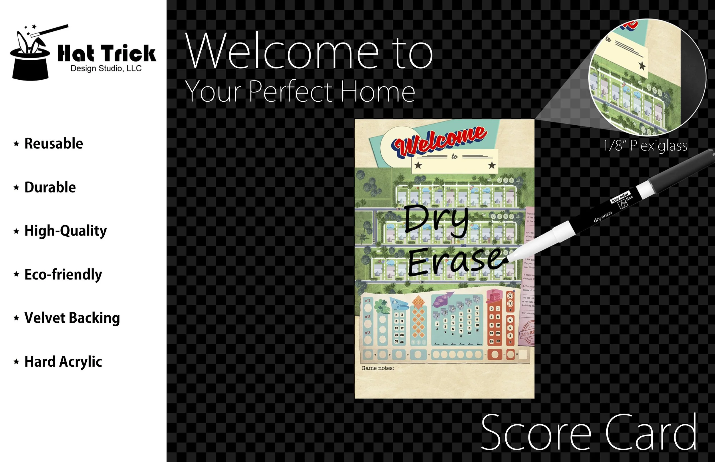 These Welcome to Your Perfect Home Score Cards are made of 1/8" PREMIUM ACRYLIC. The backing is finished with a white velvet material that is SOFT TO THE TOUCH to protect playing surfaces. Made in the USA with premium DURABLE materials to last for years.