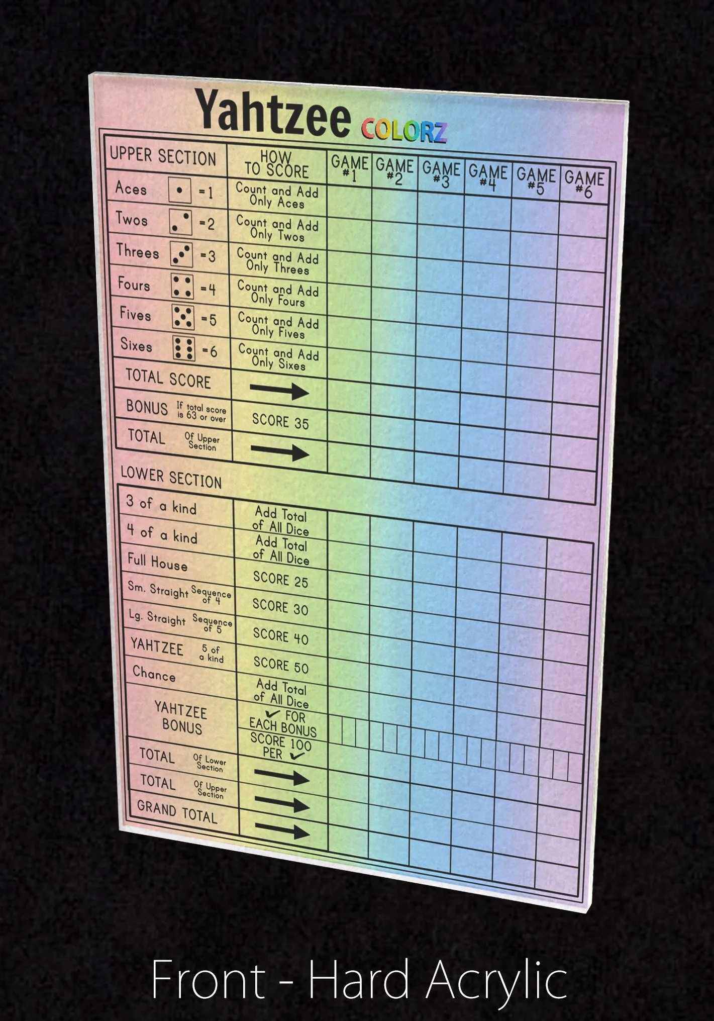 Premium Acrylic Yahtzee Colorz Score Sheet Upgrade, Reusable, Wet Erase and Dry Erase