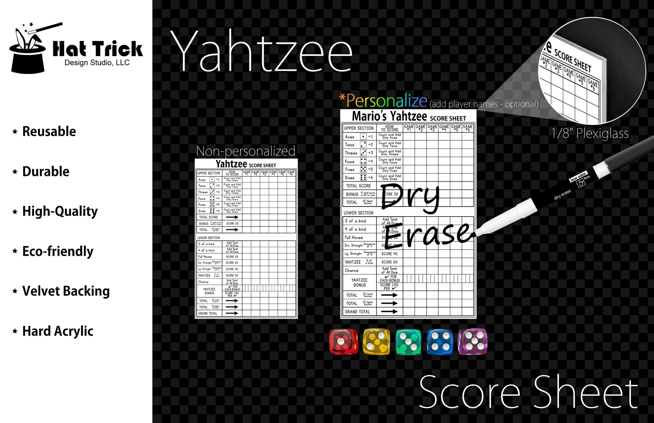 Premium Acrylic Yahtzee Score Sheet Upgrade, Reusable, Wet Erase and Dry Erase