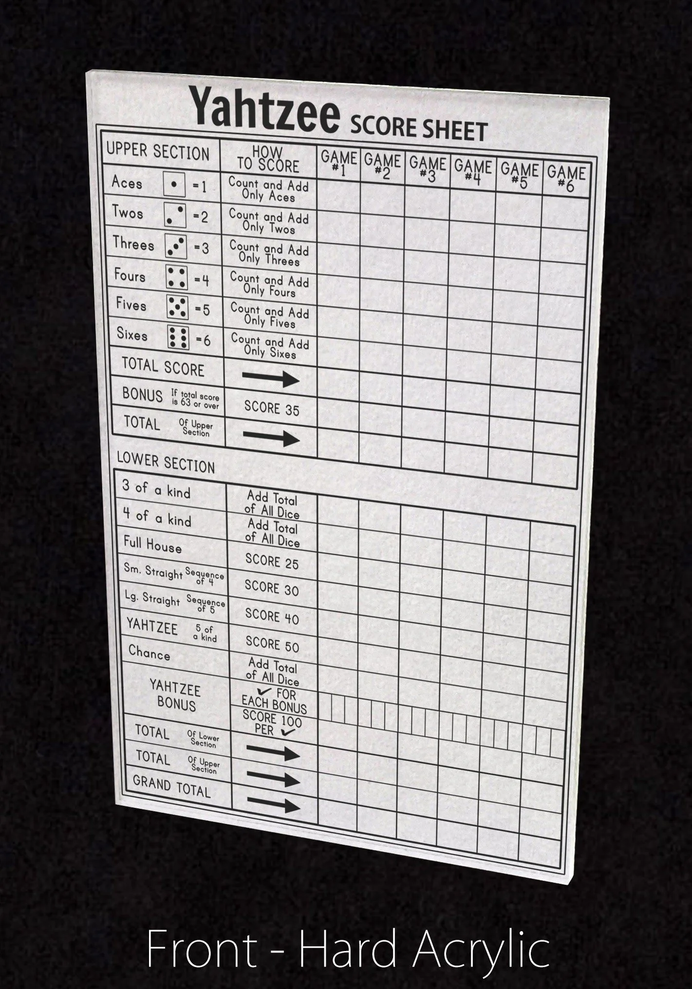 These Hard Acrylic Deluxe Yahtzee Score Sheet Plaques are made of 1/8" PREMIUM GRADE PLEXIGLASS. The backing is finished with a white velvet material that is SOFT TO THE TOUCH to protect playing surfaces. Made in the USA with premium DURABLE materials to last for years.